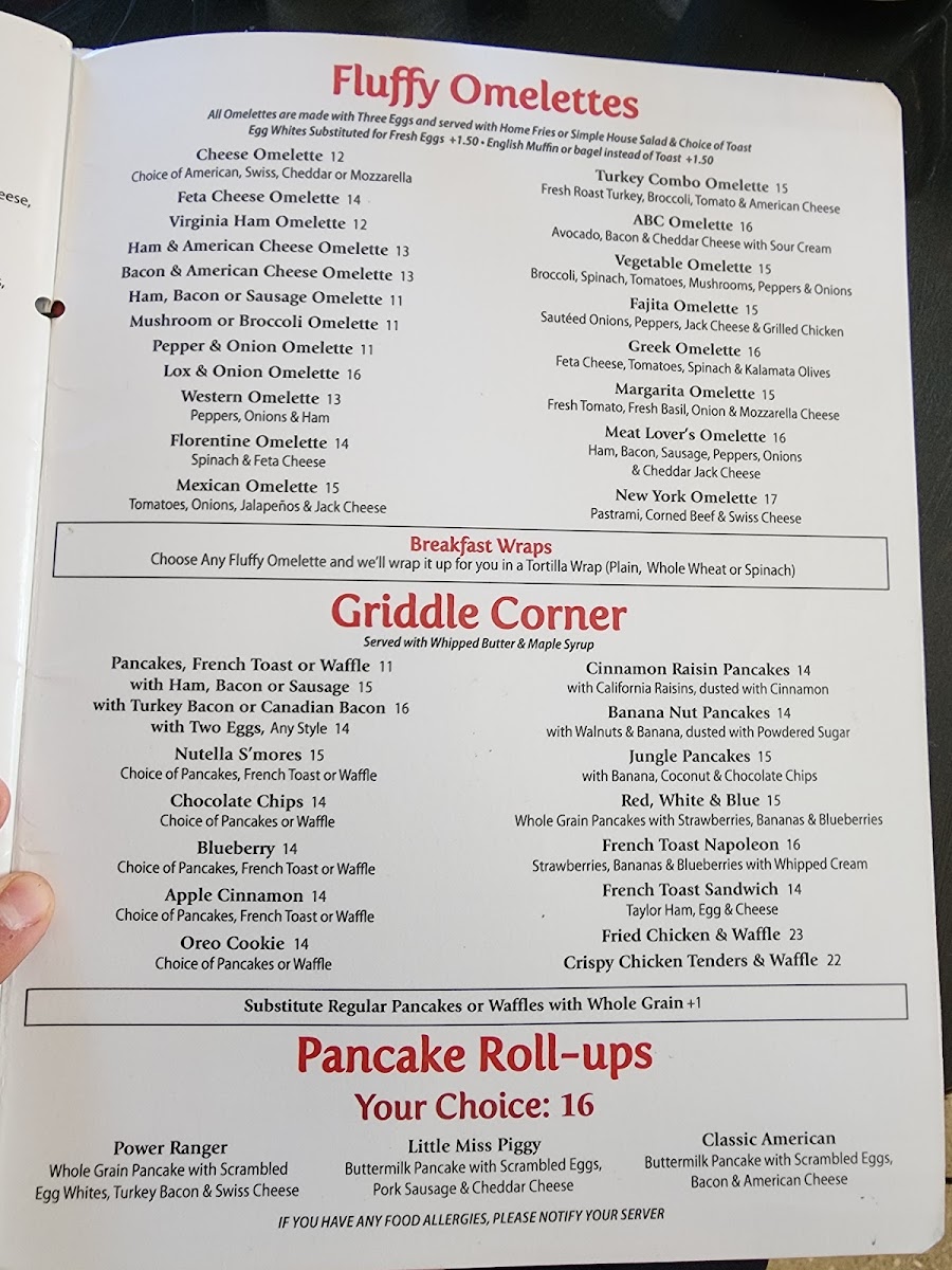 Wow this is a diner worth your time. I am so pleased with my meal that I have to say I really enjoyed everything. Meat lover fluffy omelette extra egg 2 bucks more worth it. Short stack Tripe Decker Egg sandwich Fish and chips but not any old chips we are talking sweet potato chips. fresh cut and made. 2 bucks more but worth it Honestly you will not leave hungry. Two thumbs up and 100% recommend to everyone.