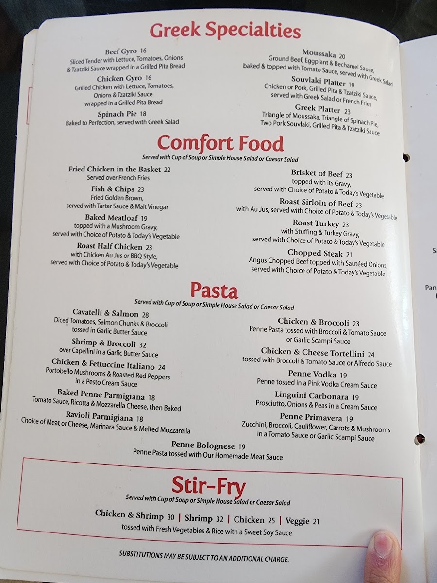 Great food at a fun diner! We had delicious salads, everything was fresh and well prepared. Menu is huge, you'll find something you'll like. Server didn't check on us, so we couldn't get questions answered after our food was served.